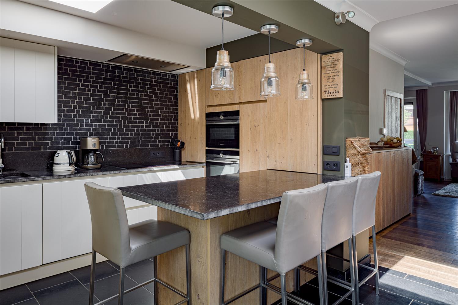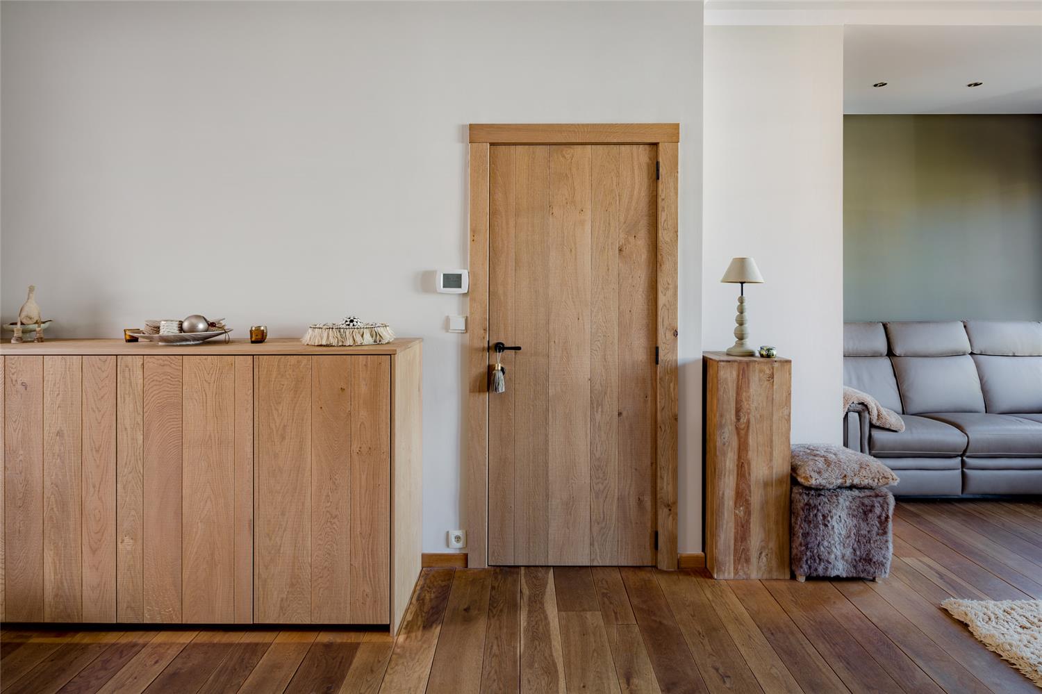 Totaalinrichting op maat: tvmeubel - haardmeubel - keuken - eikenhouten binnendeur - dressoir
